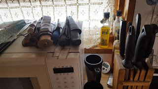 Vi måker litt sne. Vanner blomster. Rydder, flytter på ting. Tømmer frysere, kaster ørreter fra 2013 og laks fra "ukjent årstall til speking", avtiner, skrur av. En titting så ut på meg gjennom lokket i en plasteske, merket Harefoss 2007. Nå har jeg en titting i fryseren. Tømmer vann i sluker, sjekker at vannet og varmen er ok. Kaster. Setter fram søpla på tømmedagene, drar opp neste dag og setter den tilbake. Tar inn post. Går gjennom bøker, ser i skap og skuffer.